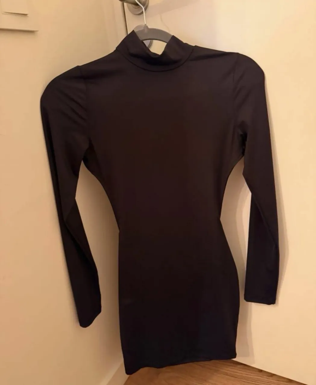 Vestido negro de cuello alto y mangas largas. Posee un recorte en la parte trasera