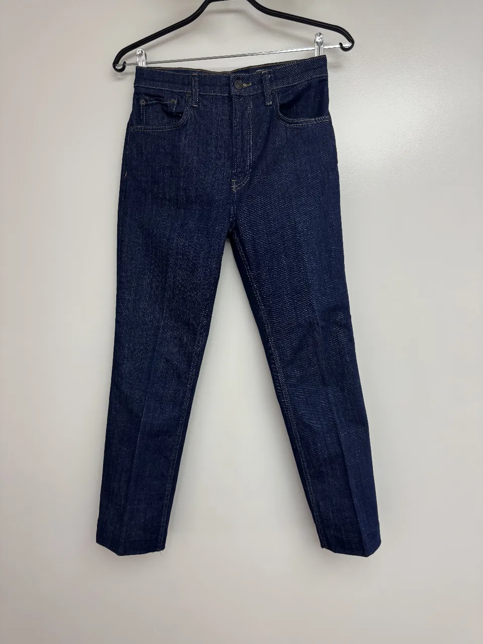 Jeans de tiro alto, corte recto y color azul oscuro. Un clásico que no puede faltar en tu guardarropa, ideal para combinar con cualquier tipo de prenda.
