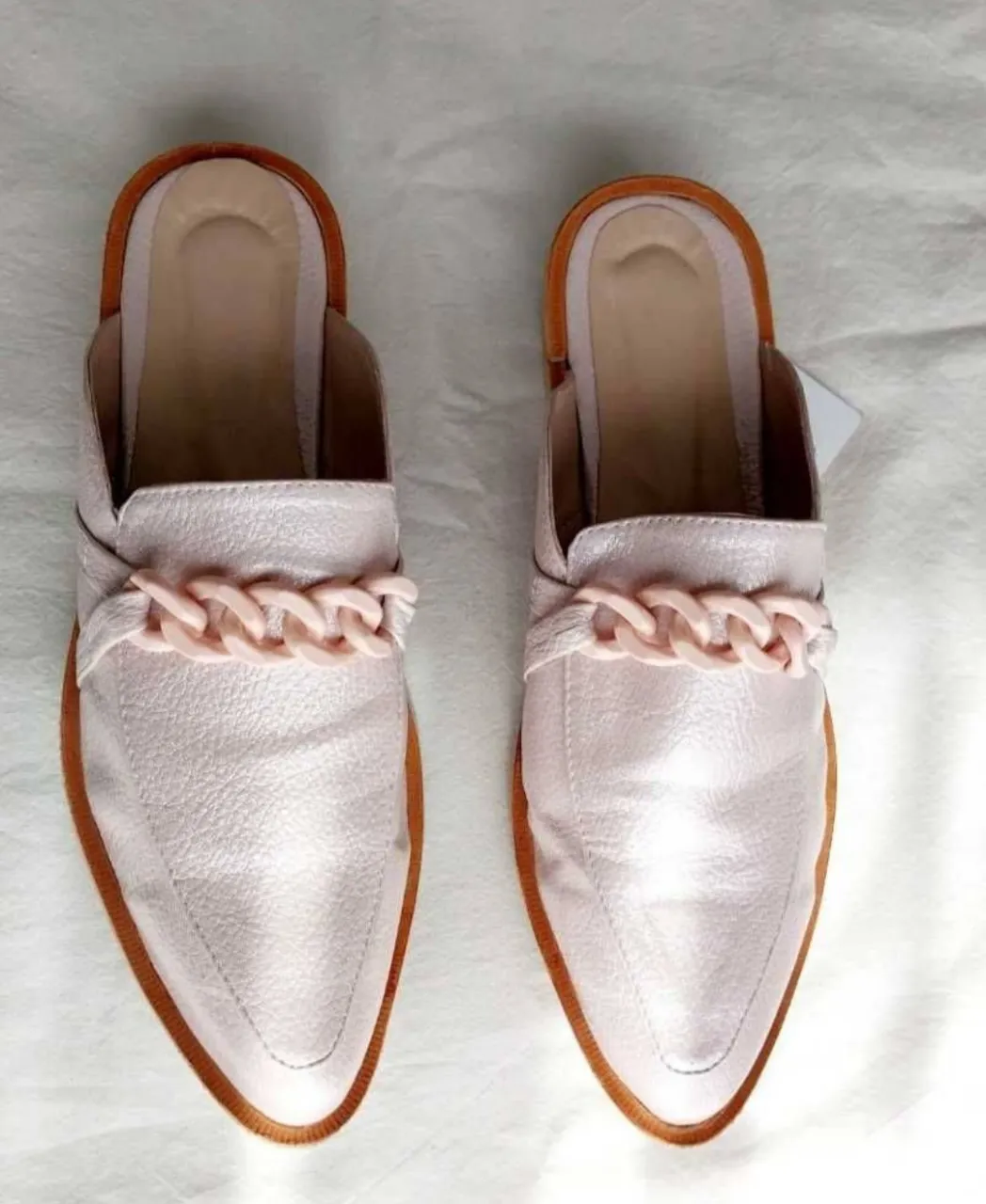 Mocasines destapados color rosa gold pálido con detalle de cadena al tono. Punta fina y suela marrón. Ideales para un look canchero y moderno.plantilla 25cm