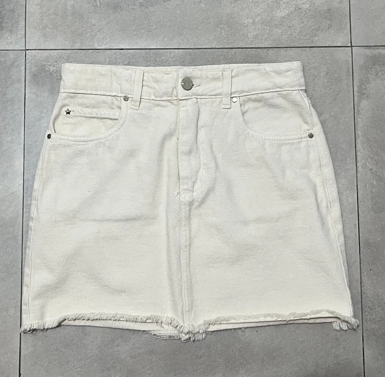 Pollera de jean color crudo con detalles de deshilachado en el ruedo. Posee bolsillos delanteros y traseros.