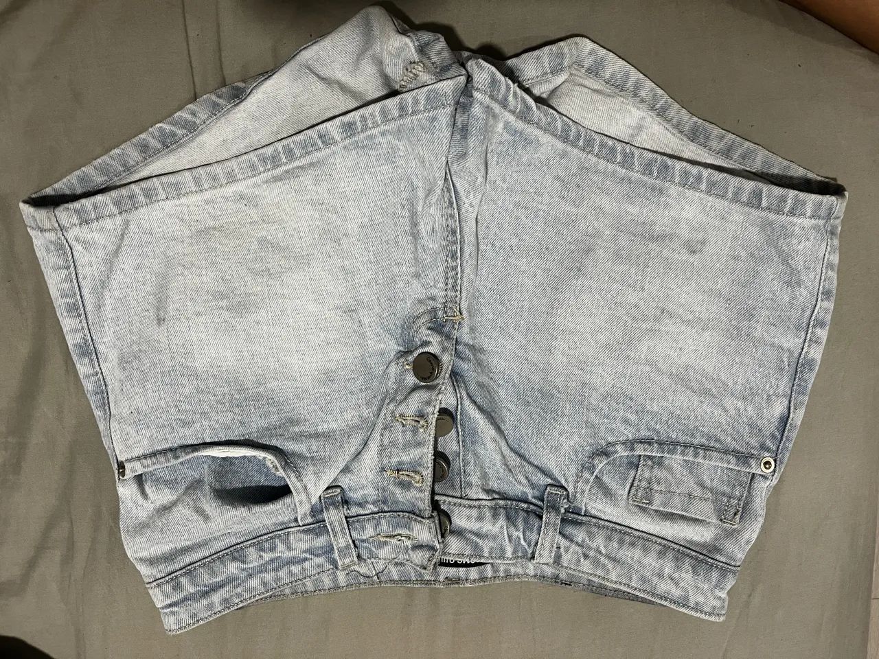 Shorts de jean tiro alto con botones al frente. Lavado claro y desgastado, con bolsillos funcionales. Perfectos para un look casual de verano.