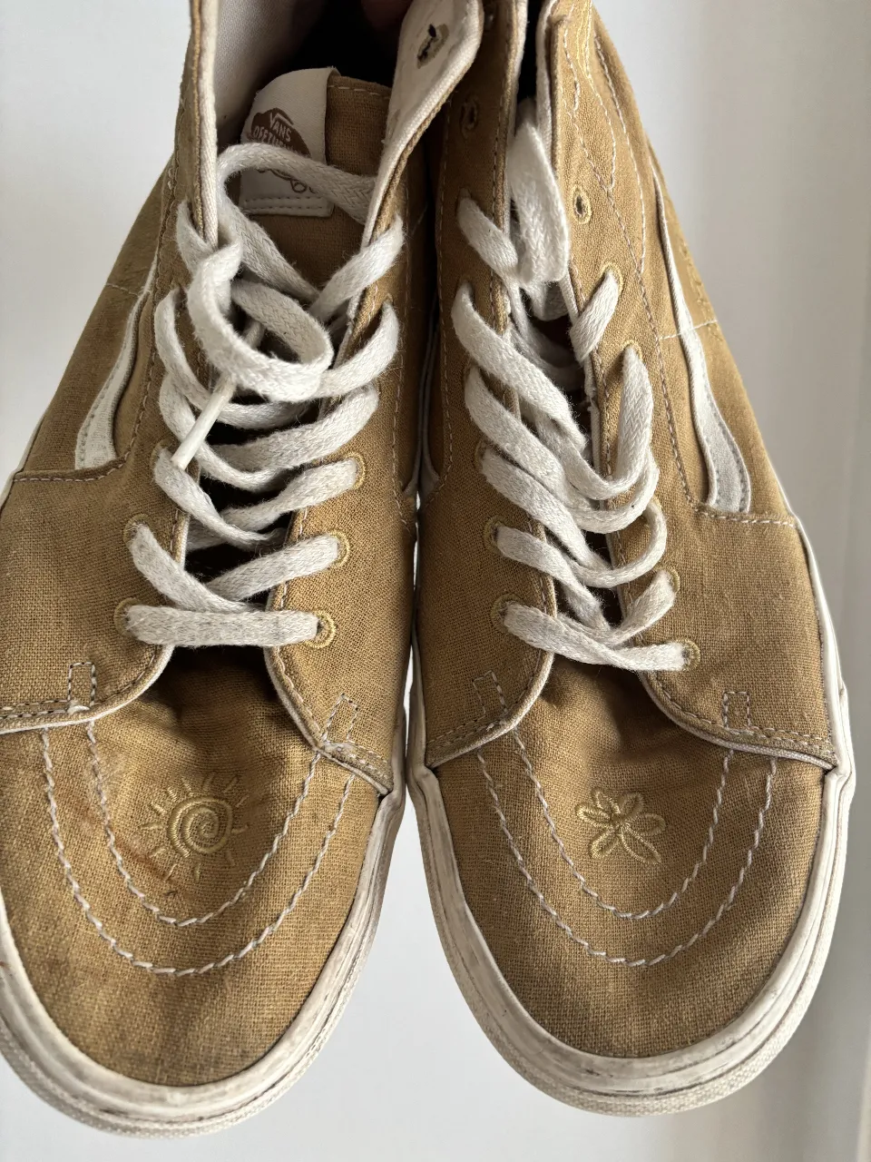 Zapatillas altas de lona color tiza con detalles bordados de sol, arcoíris y corazón. Cordones blancos y suela de goma.