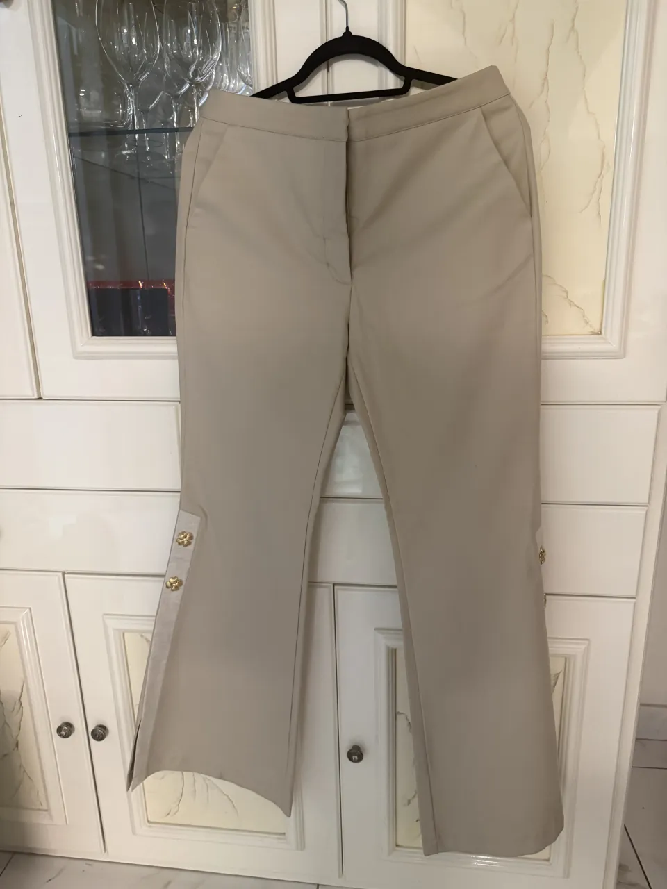 Pantalón Jazmin Chebar, color beige con detalles de botones dorados en forma de trébol en los laterales inferiores. Posee una abertura en el bajo de cada pierna. un solo uso.