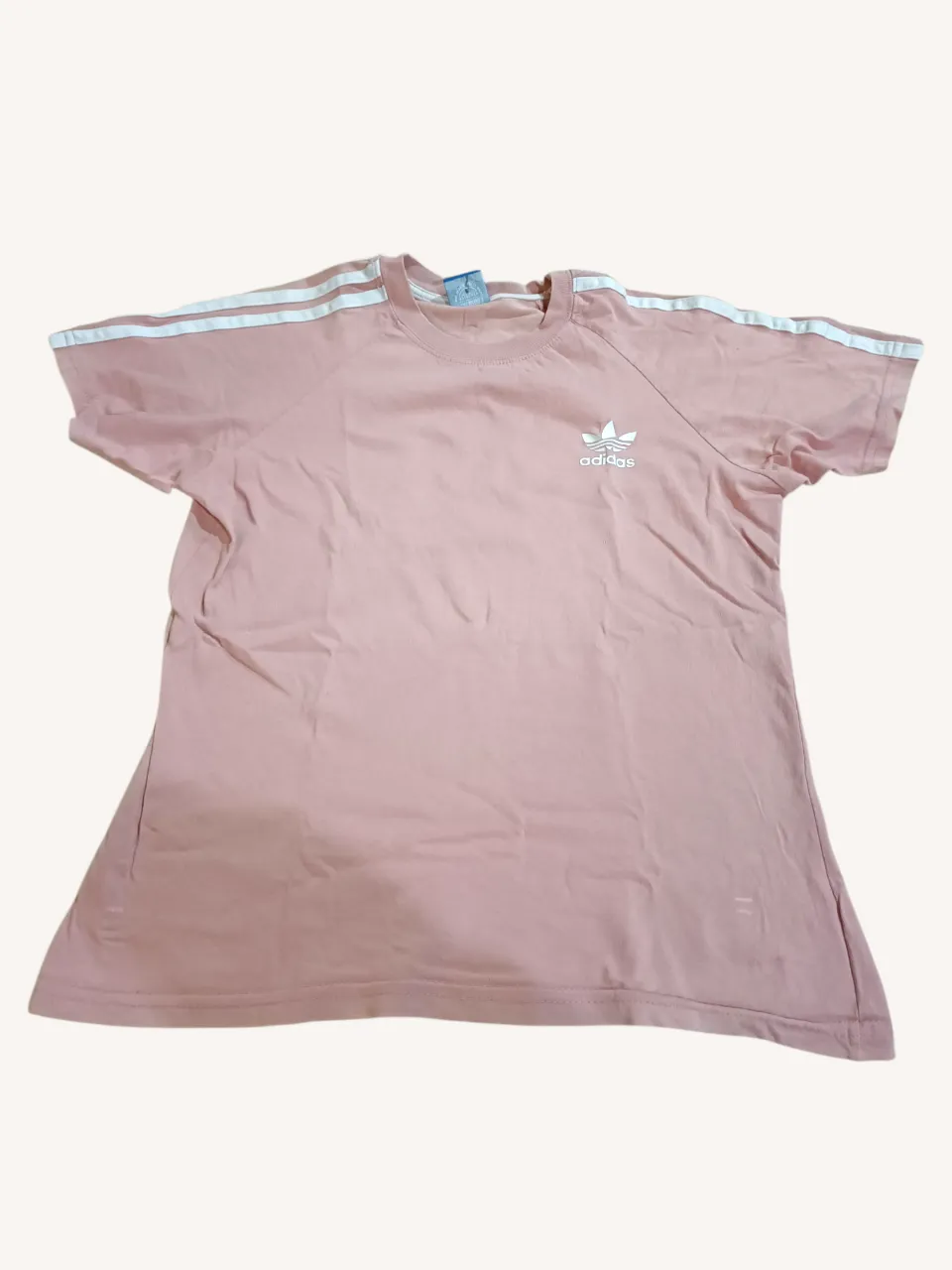 Remera manga corta de color rosa pálido con tres tiras blancas en las mangas y logo de Adidas en el frente.