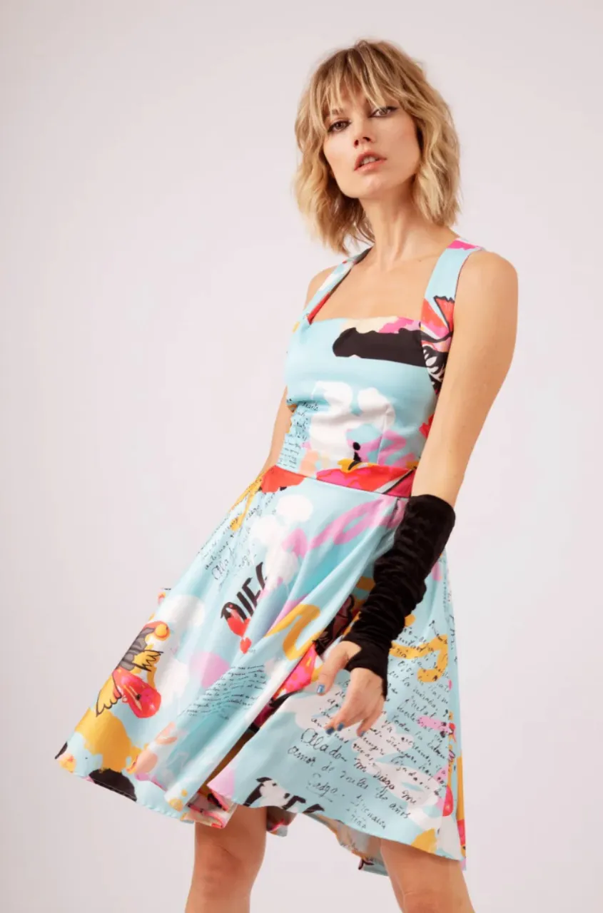 Vestido corto con estampa vibrante y diseño cruzado en la espalda. Ideal para un look divertido y original. tiene un solo uso