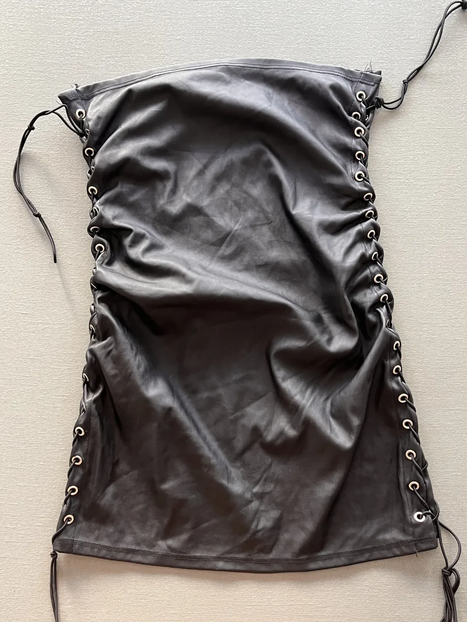 Vestido negro de cuero sintético con detalles de cordones y ojales en los laterales. Diseño ajustado y moderno, ideal para salidas nocturnas o eventos.