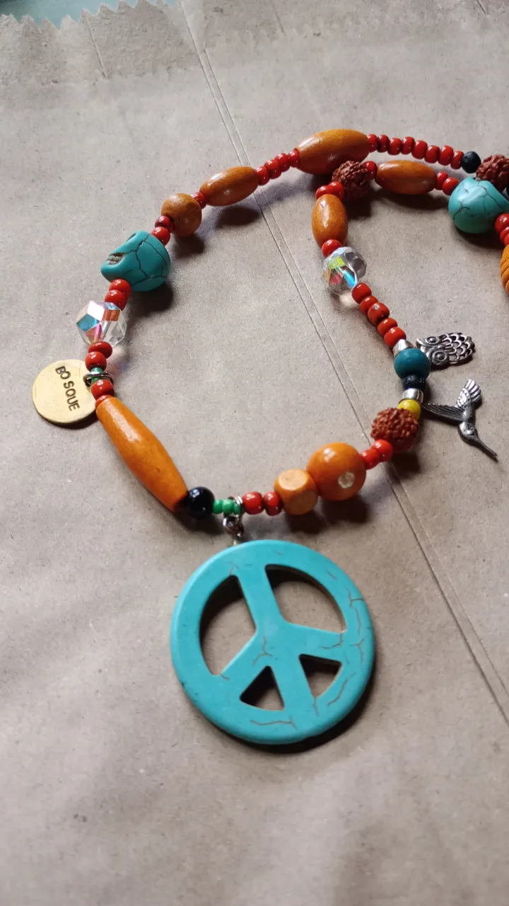Collar Bosque, compuesto por dos dijes de plata, uno de bronce, piezas de resina, cristal de roca, cuentas de madera, piedra volcánica, semillas de rudraksha y mostacillas ¡Un accesorio único para darle un toque boho a tu look!