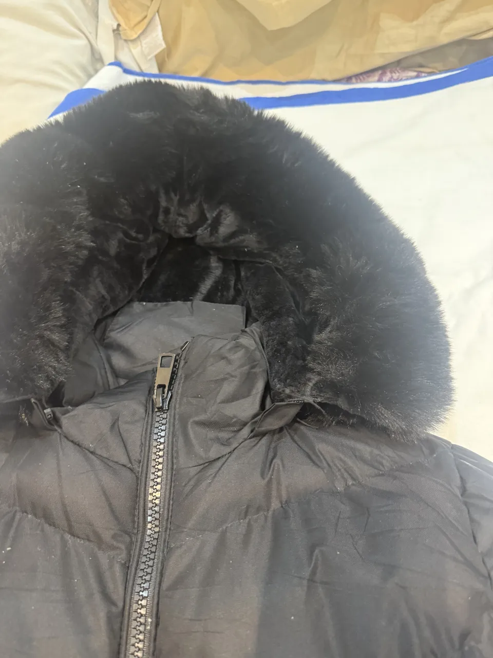 Campera larga negra con capucha de pelo sintético. Cierre frontal y bolsillos con cierre.