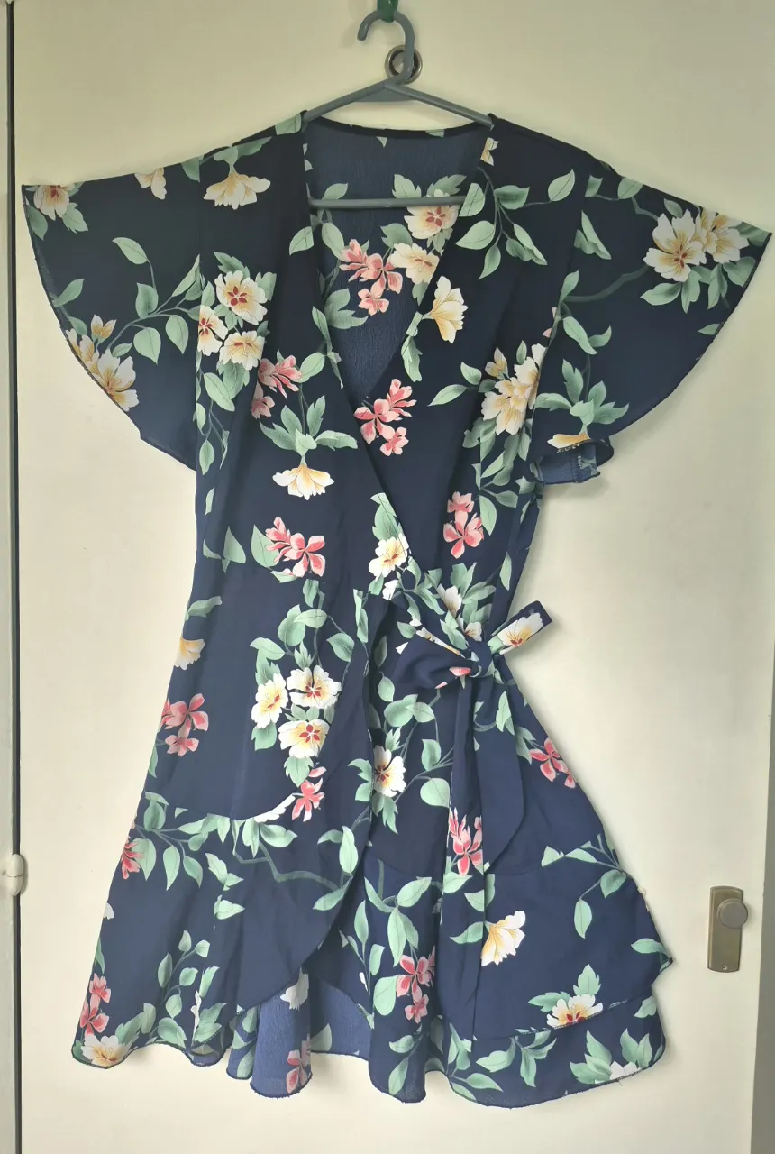 Vestido cruzado con estampado floral vibrante en fondo azul marino. Posee mangas cortas tipo mariposa y un lazo para ajustar en la cintura. Ideal para un look fresco y femenino.