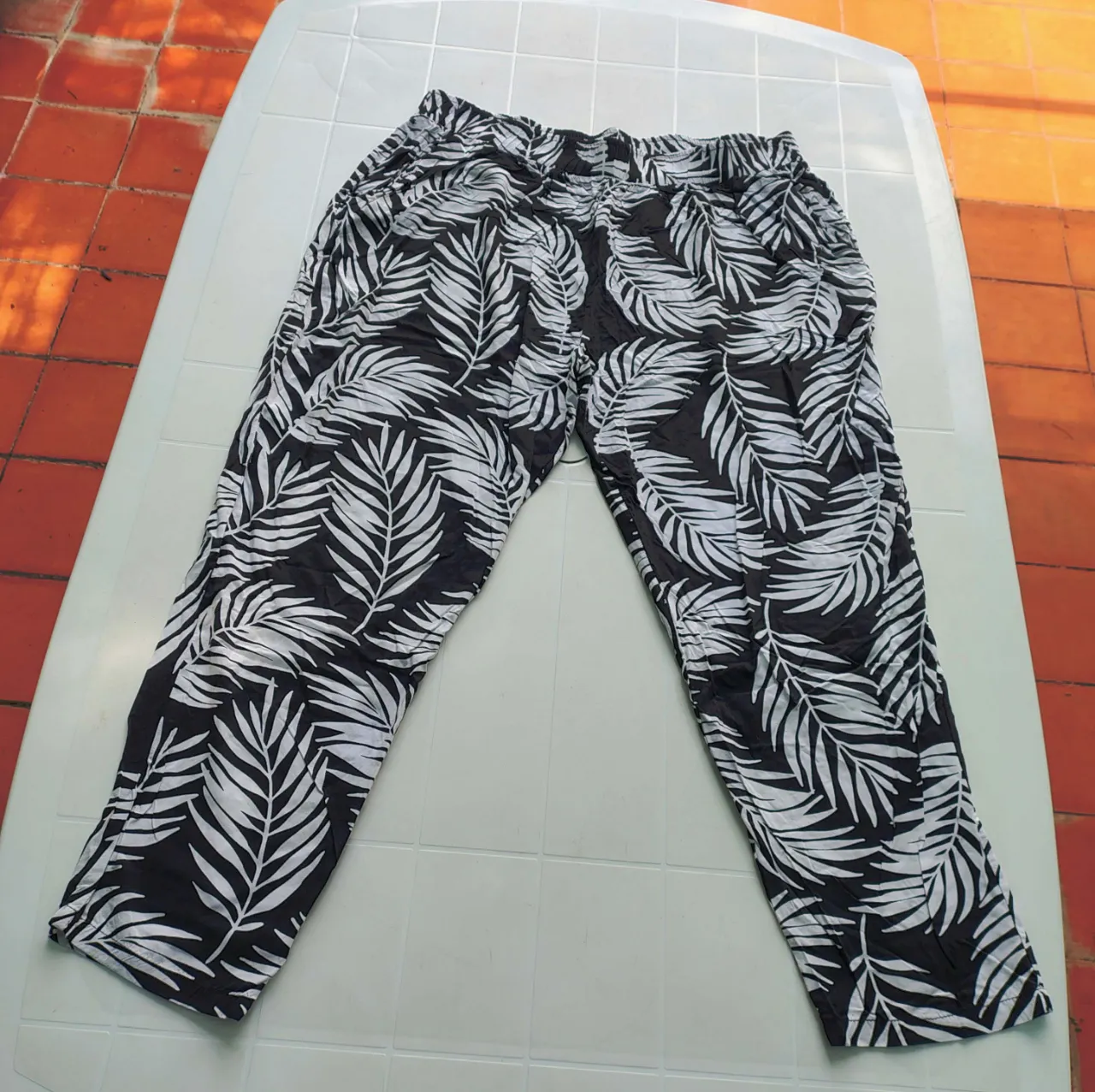 Pantalón estampado con hojas en blanco y negro. Cintura elastizada y bolsillos laterales. sin uso.