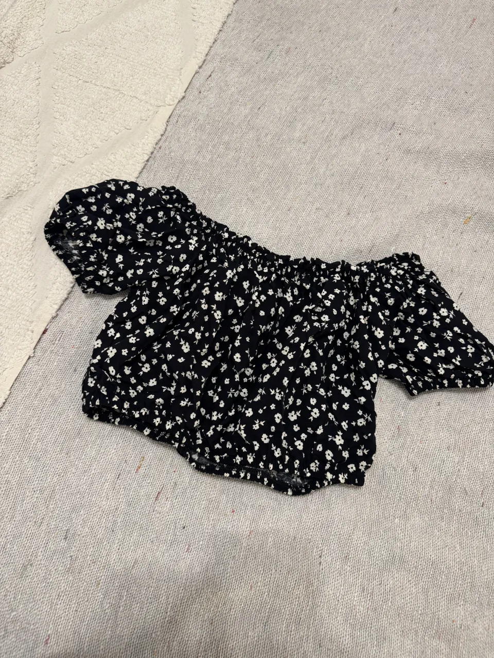 Top negro con estampa de flores blancas. Posee mangas cortas abullonadas y escote elástico.