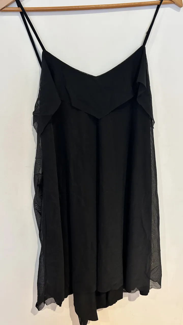 Vestido negro corto con tiras finas y detalles de tul. Ideal para una salida nocturna o una ocasión especial.