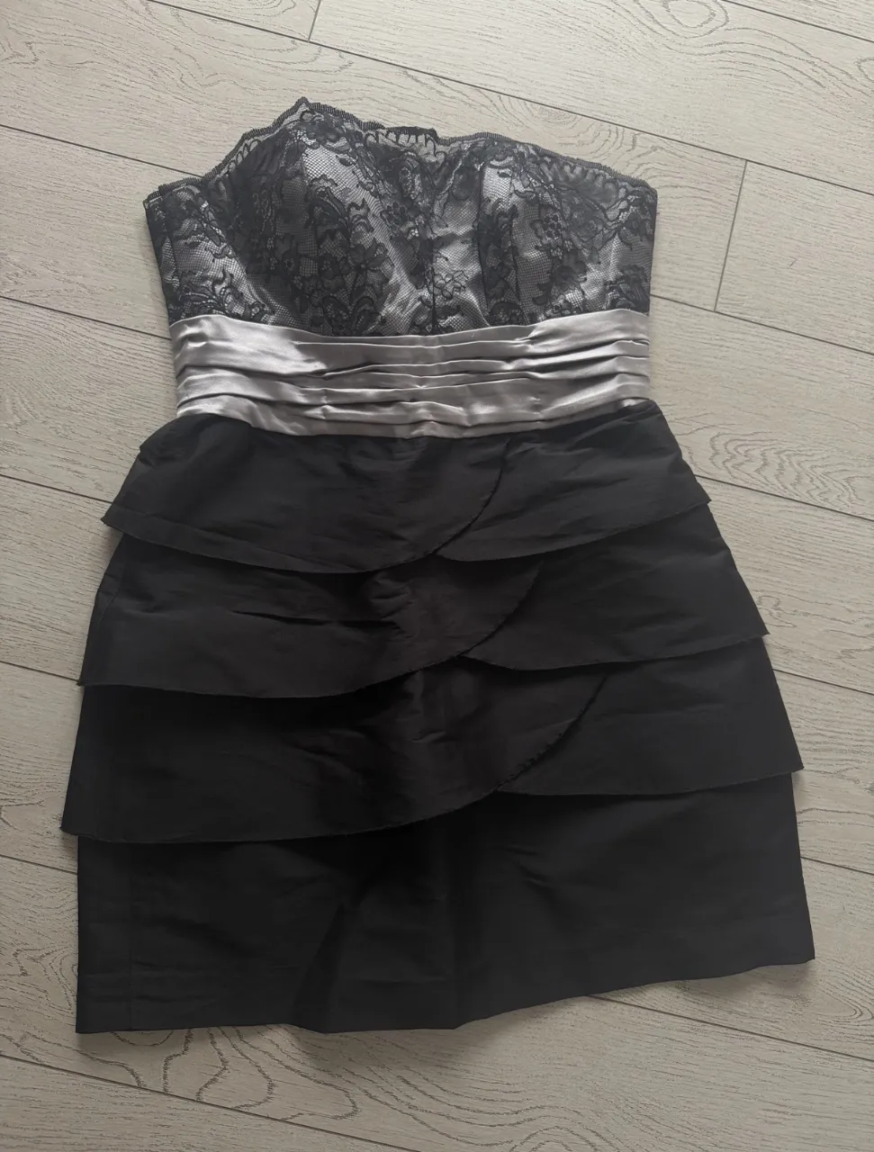 Medidas de sisa a sisa 38cm largo 61 cm cintura 34 cm largo pollera 42 cm cadera 47 cm . Queda divino puesto strappless con encaje negra sobre raso gris con faja en gris. Pollera con volados . Hecho por modista todo forrado y ballenita de costado Se puede retirar por caballito o pto madero