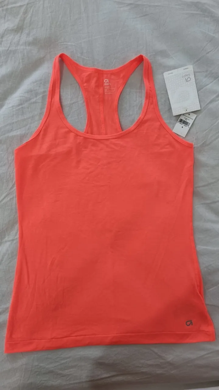 Musculosa deportiva GapFit en color naranja vibrante, ideal para entrenamientos o actividades al aire libre. Su diseño de espalda cruzada (racerback) permite total libertad de movimiento. mosculosa gap mujer deportiva color naranja fluor talle s medidas de la prenda, busto 40, largo 64 prenda traidas del gap en japon