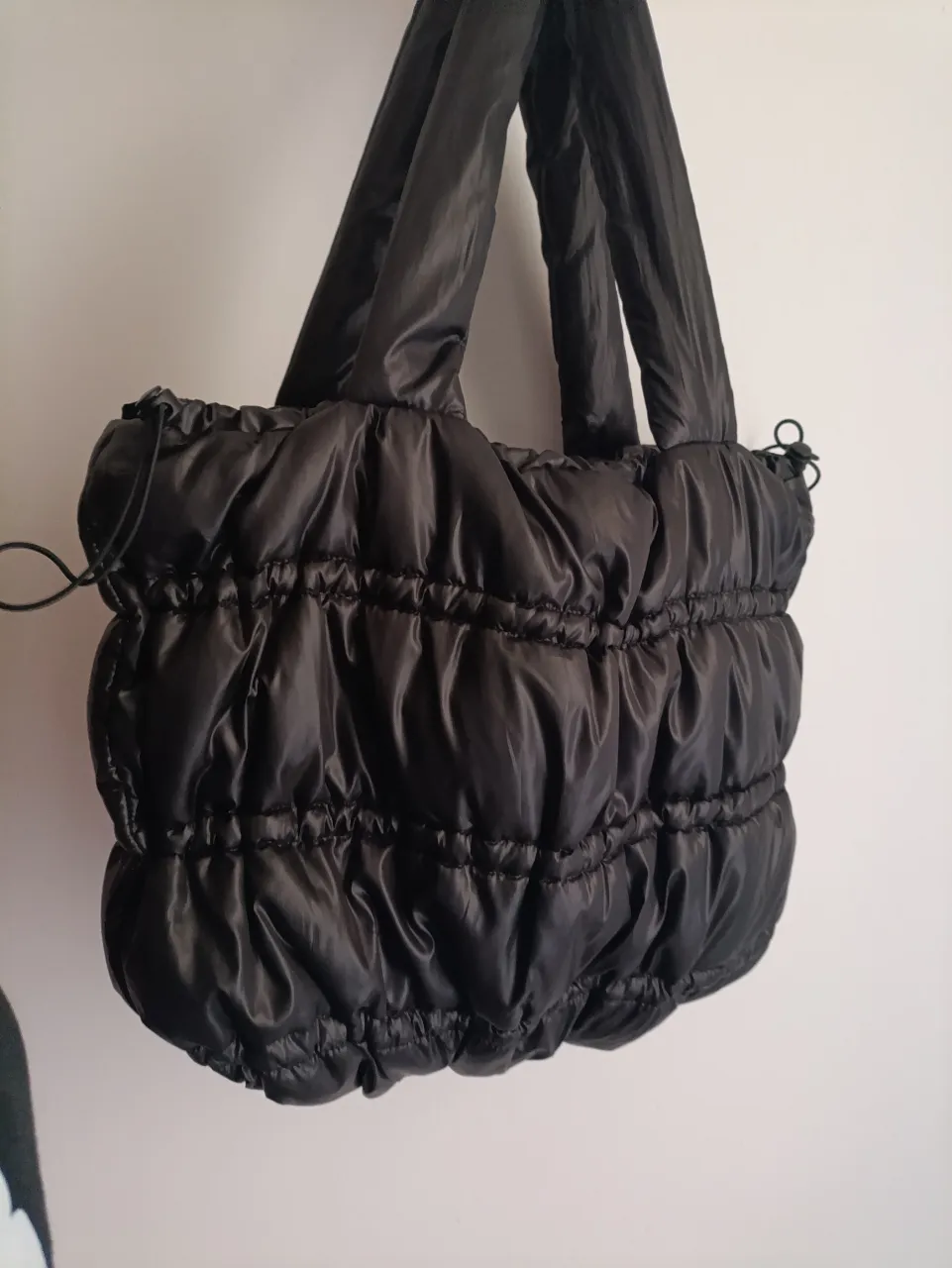 Bolso negro acolchado con diseño fruncido. Cómoda y amplia.