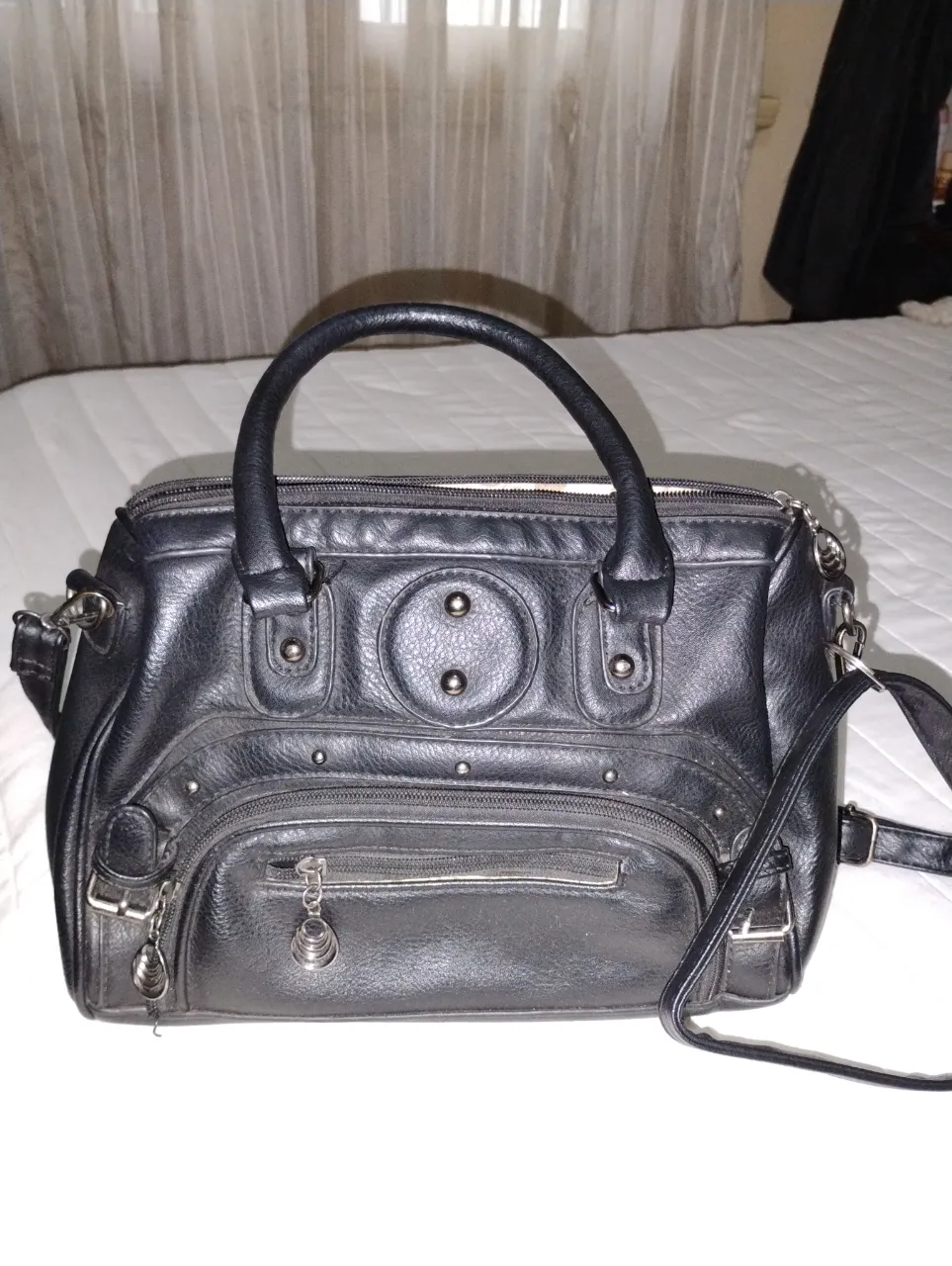 Bolso negro de cuero sintético, con múltiples compartimentos y cierres. Tiene manijas cortas y una correa larga desmontable. Ideal para el día a día o para salir.