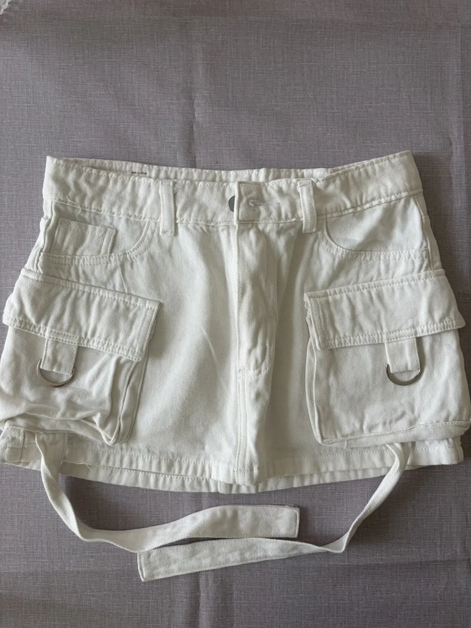 Pollera de jean blanco tiro alto con bolsillos cargo y cinturón. Ideal para un look canchero y moderno.