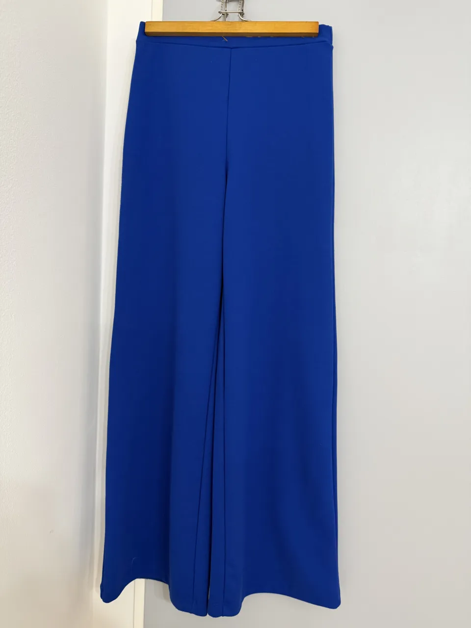 Pantalón azul de tela lisa, con cintura alta y pierna ancha. Elastiza, se adapta. Medidas (son aproximadas y en línea recta): -cintura: 35 cm -tiro: 29 cm -largo: 1,04 cm