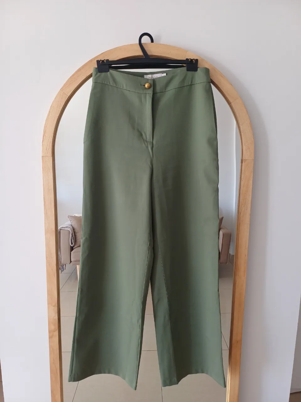 Pantalón sastrero BOON color verde con botón dorado. Tiene bolsillos delanteros funcionales. Talle S amplio. Referencias: mi cintura mide 70cm y mis caderas 104cm.