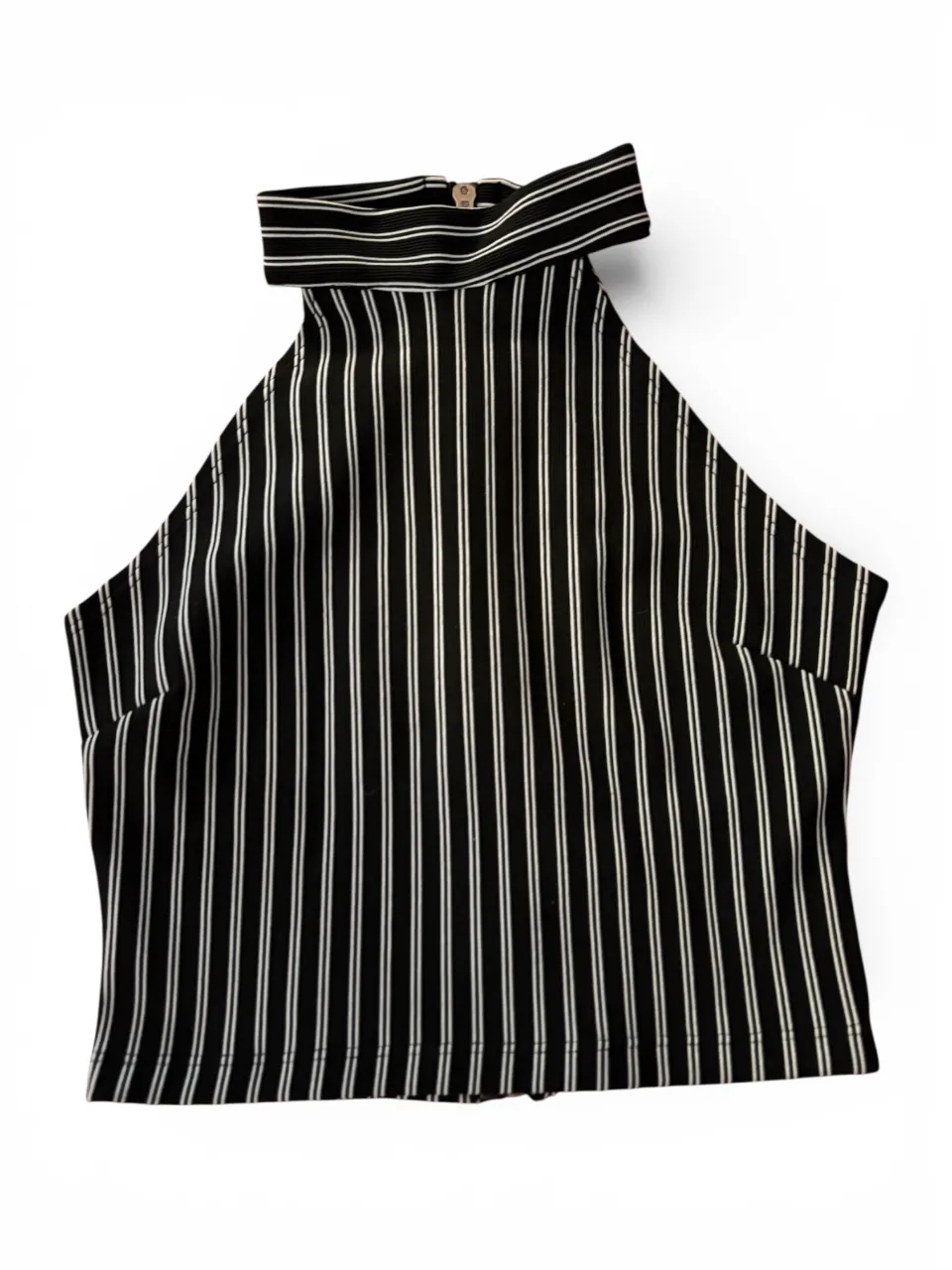 Top a rayas verticales en blanco y negro, con cuello alto y cierre al frente. Un diseño moderno y canchero, ideal para looks urbanos y audaces.