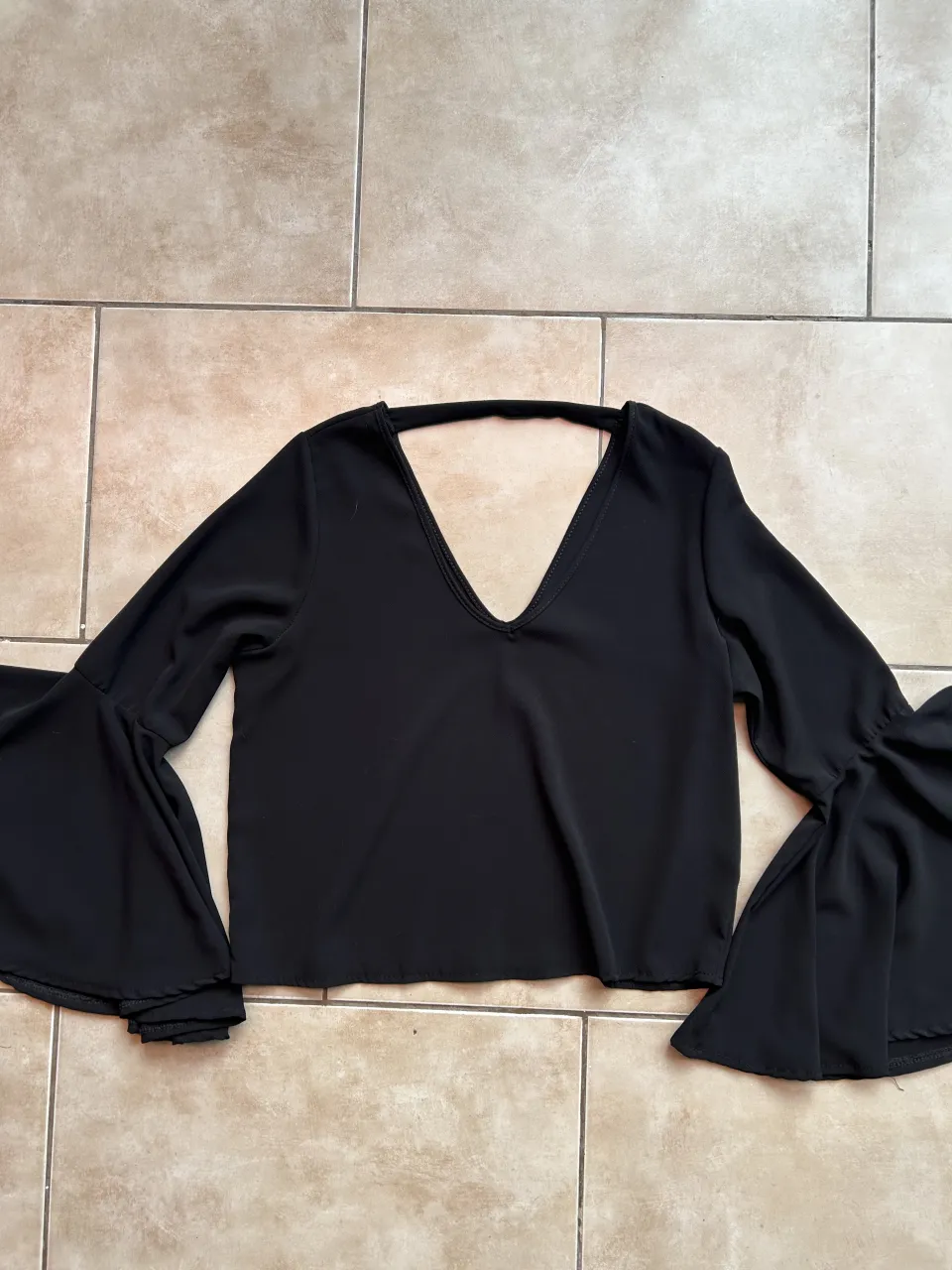 Blusa negra con mangas acampanadas y escote en V pronunciado. Diseño moderno y canchero, ideal para lucir en salidas o fiestas. Su corte abierto en la espalda le da un toque sensual y a la moda.