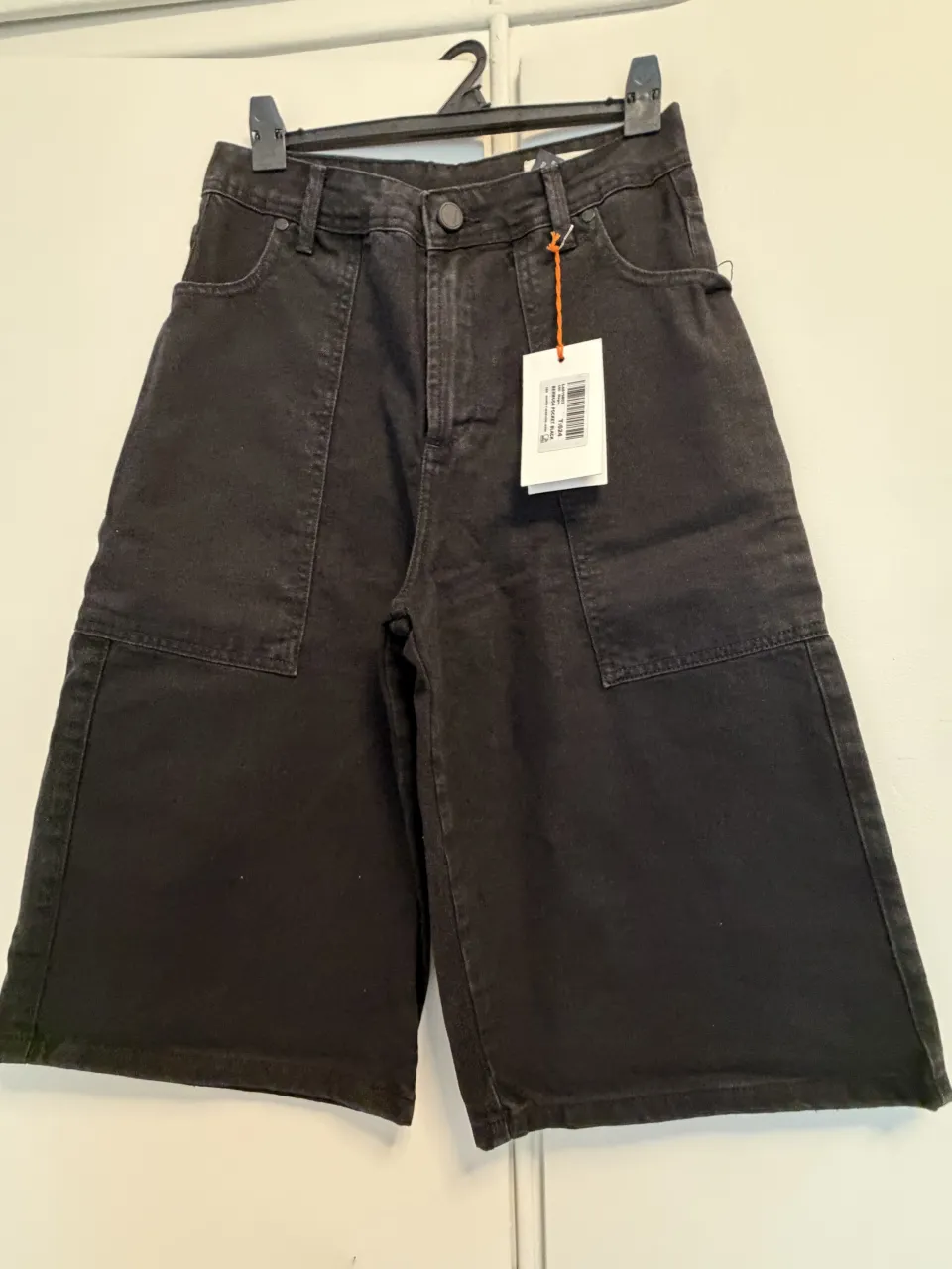 Bermuda ancha y larga de jean negra con bolsillos cargo.