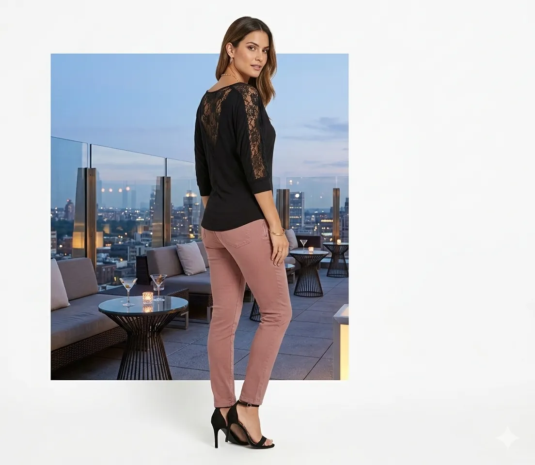 Remera negra con detalle de encaje floral en espalda, hombros y mangas 3/4 Escote redondo, terminación de encaje espalda en V transparente. 94% viscosa 6% lycra Talle M Largo 55cm Hombros 43cm