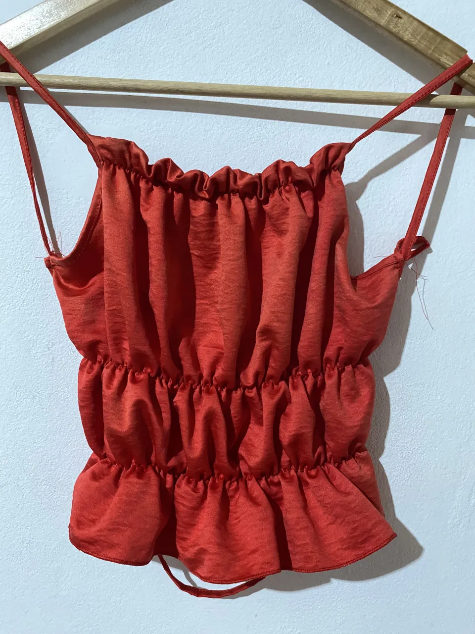 Top rojo con tiras finas y fruncido en el escote y en la cintura. Posee elástico en la cintura y detalle de volado en el borde inferior.