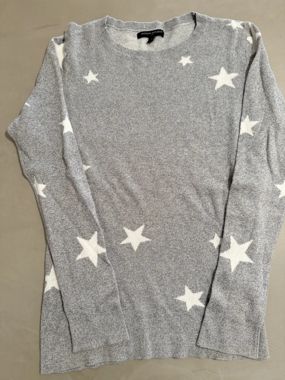 Sweater gris con estampa de estrellas blancas en mangas y frente. Cuello redondo.