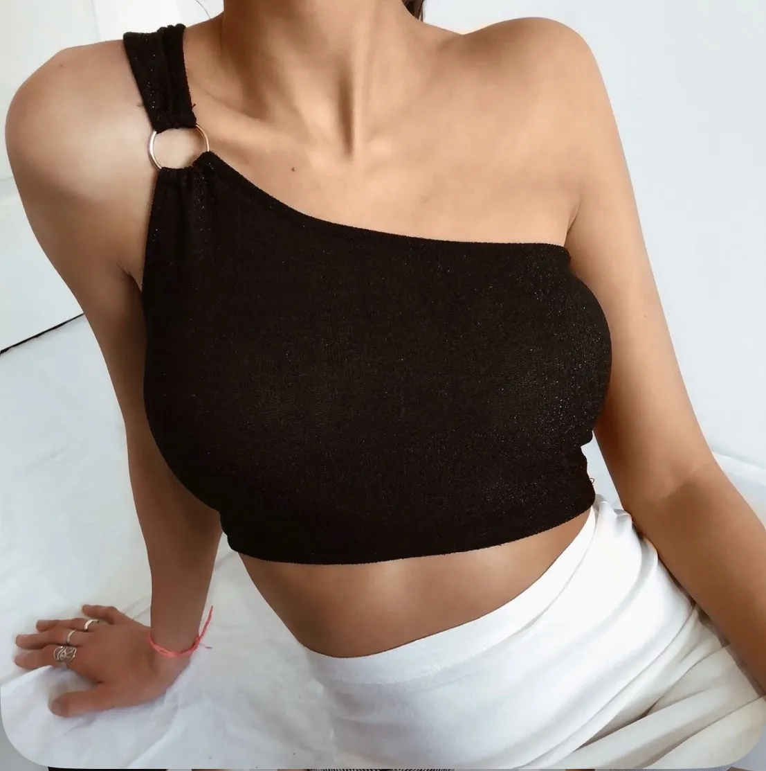 Top negro de lurex con brillos de un solo hombro con detalle de argolla metálica. Un diseño súper canchero y moderno, ideal para destacar en cualquier salida. Medidas: busto 30cm largo 18cm