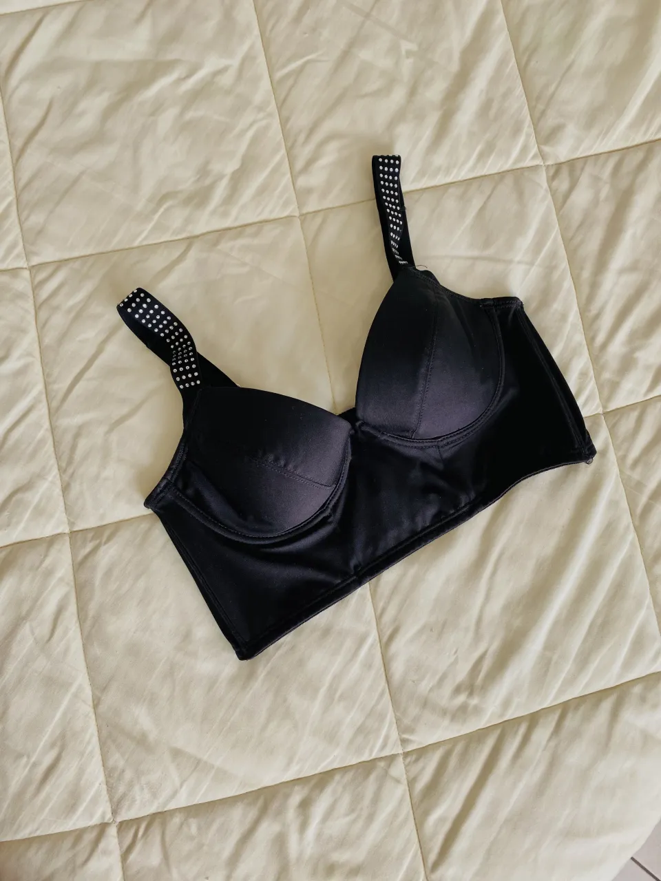 Top negro con tiras adornadas con strass. Talle 3 es un 85/90 de busto. solo le falta un strass que puesto el top no se ve