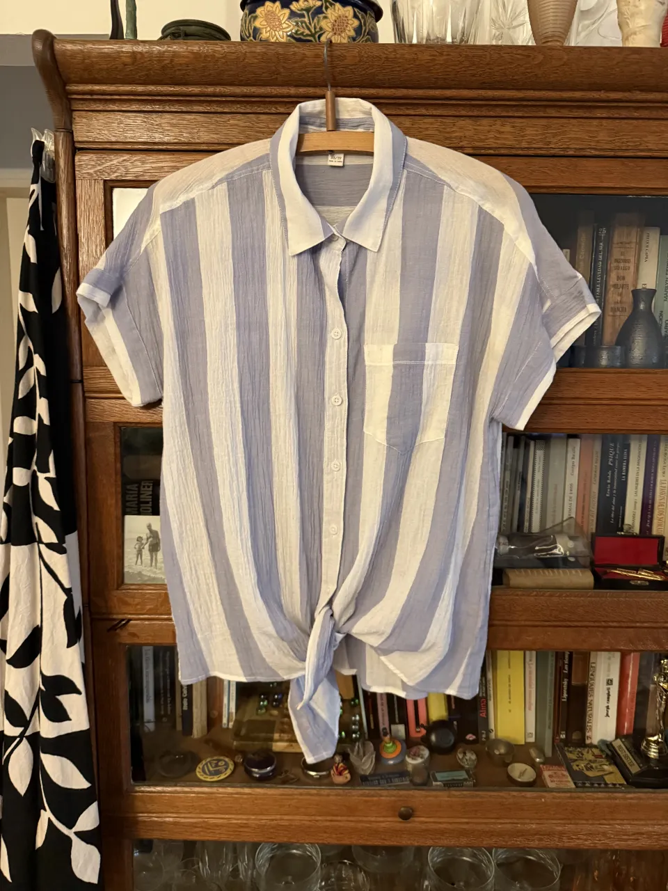 Camisa a rayas verticales celestes y blancas, con cuello de camisa y botones al frente. Tiene un bolsillo en el pecho y se anuda en la parte inferior. Las mangas son cortas. Dice S pero es casi M