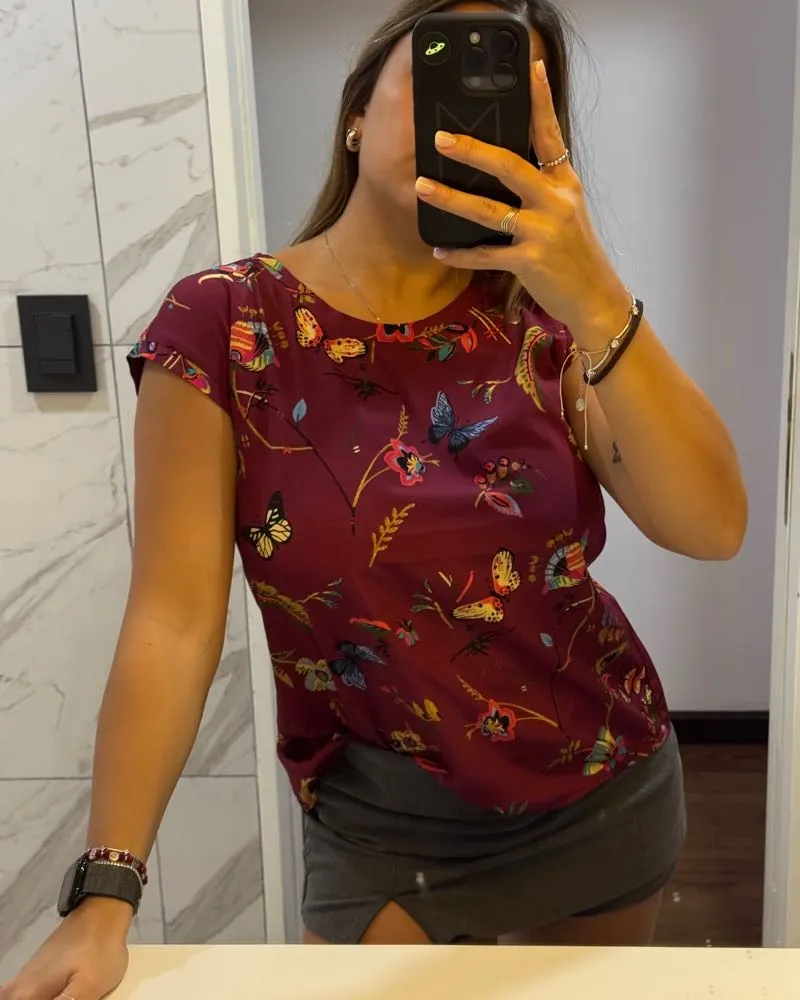 Remera estampada con mariposas y flores en tonos borravino, con mangas cortas y cuello redondo.