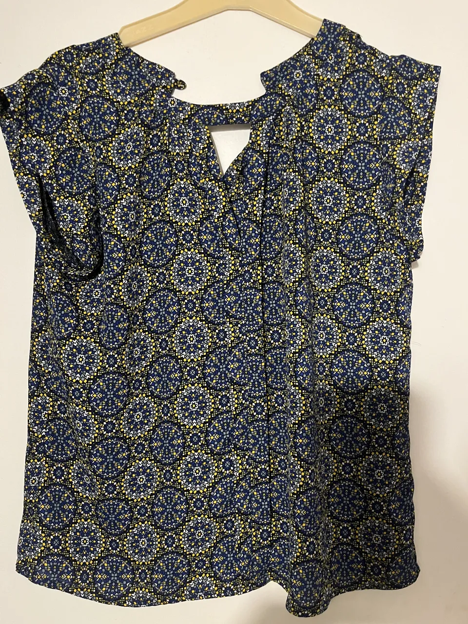 Remera estampada con un diseño geométrico en tonos azules y amarillos. Posee un corte moderno con una abertura en la espalda y mangas cortas tipo mariposa. Ideal para un look casual y fresco.