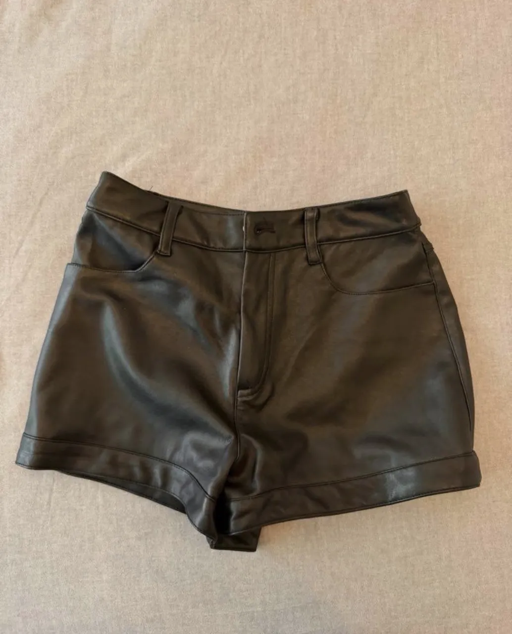 Shorts de cuero negro con bolsillos delanteros y traseros.