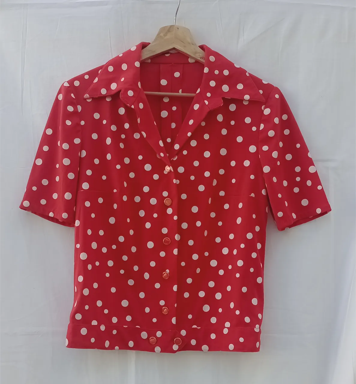 ¡Divina camisa roja con lunares blancos! Un clásico que nunca pasa de moda, perfecta para darle un toque retro y alegre a tu look. Ideal para combinar con jeans o una pollera.