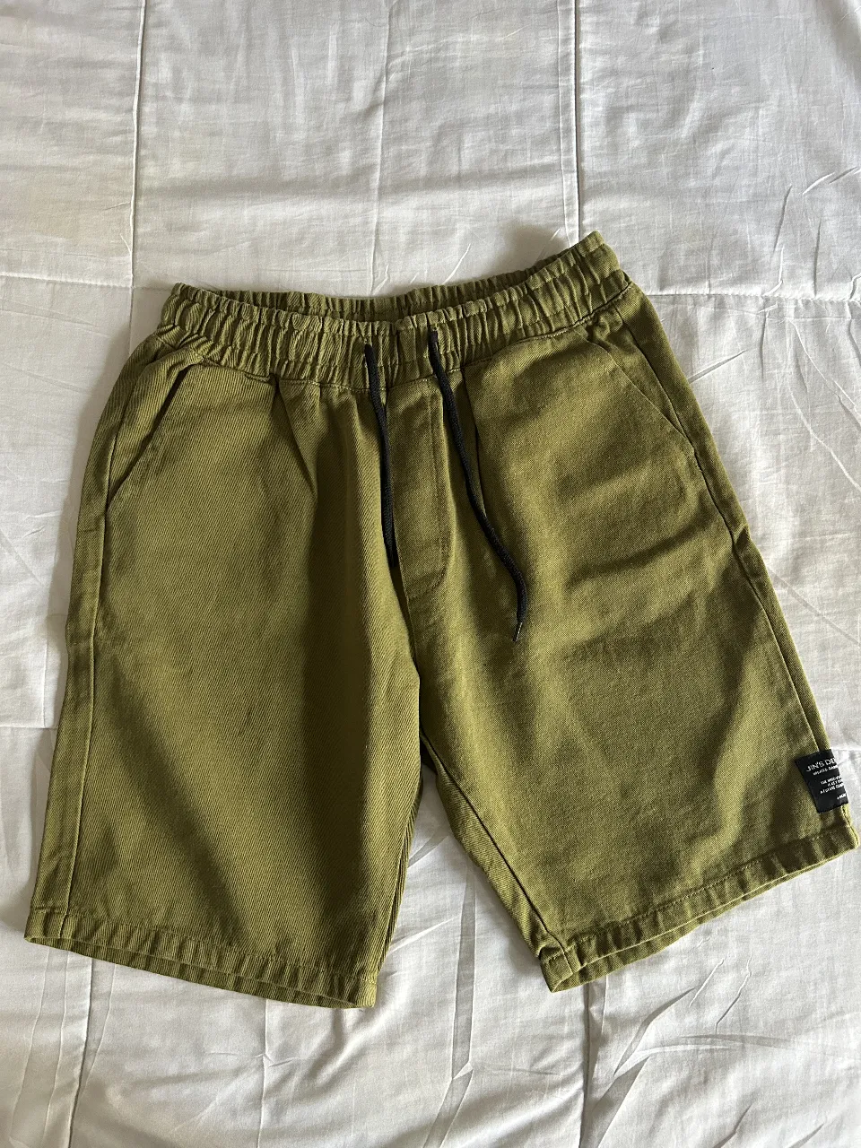 Shorts de gabardina color verde militar, con cintura elastizada y cordón de ajuste. Posee bolsillos frontales y traseros. Ideales para un look casual y cómodo.