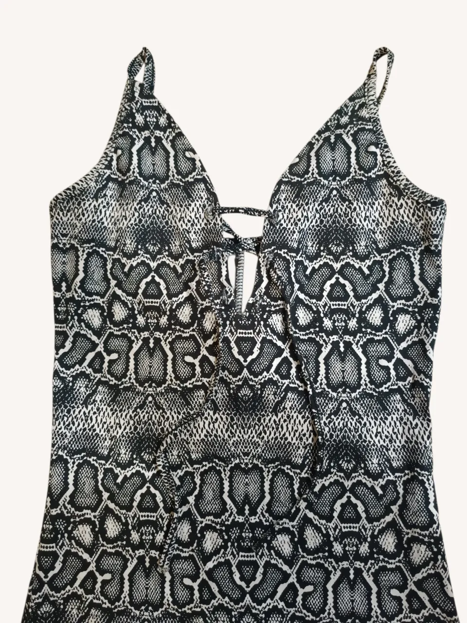 Vestido corto con estampado de serpiente en blanco y negro. Posee breteles finos y escote en V con detalle de lazo. 📏Medidas: cintura 32 cm Largo 76 cm total (incluidos los breteles). Tela elastizada.