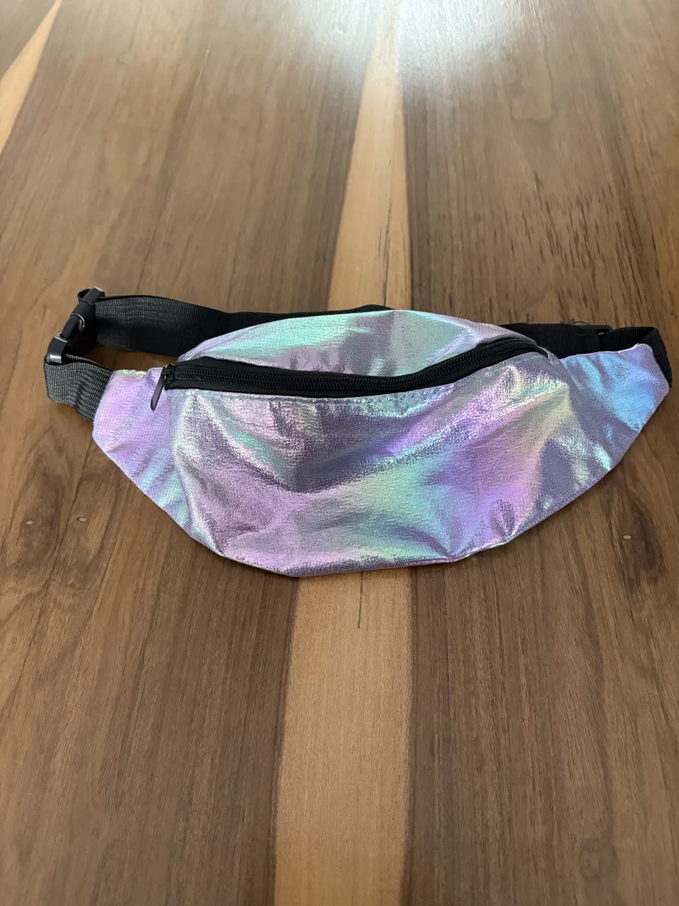 Riñonera súper canchera con un brillo iridiscente que cambia de color. Ideal para llevar tus esenciales con onda. Perfecta para festivales, salidas o para darle un toque moderno a tu look diario.