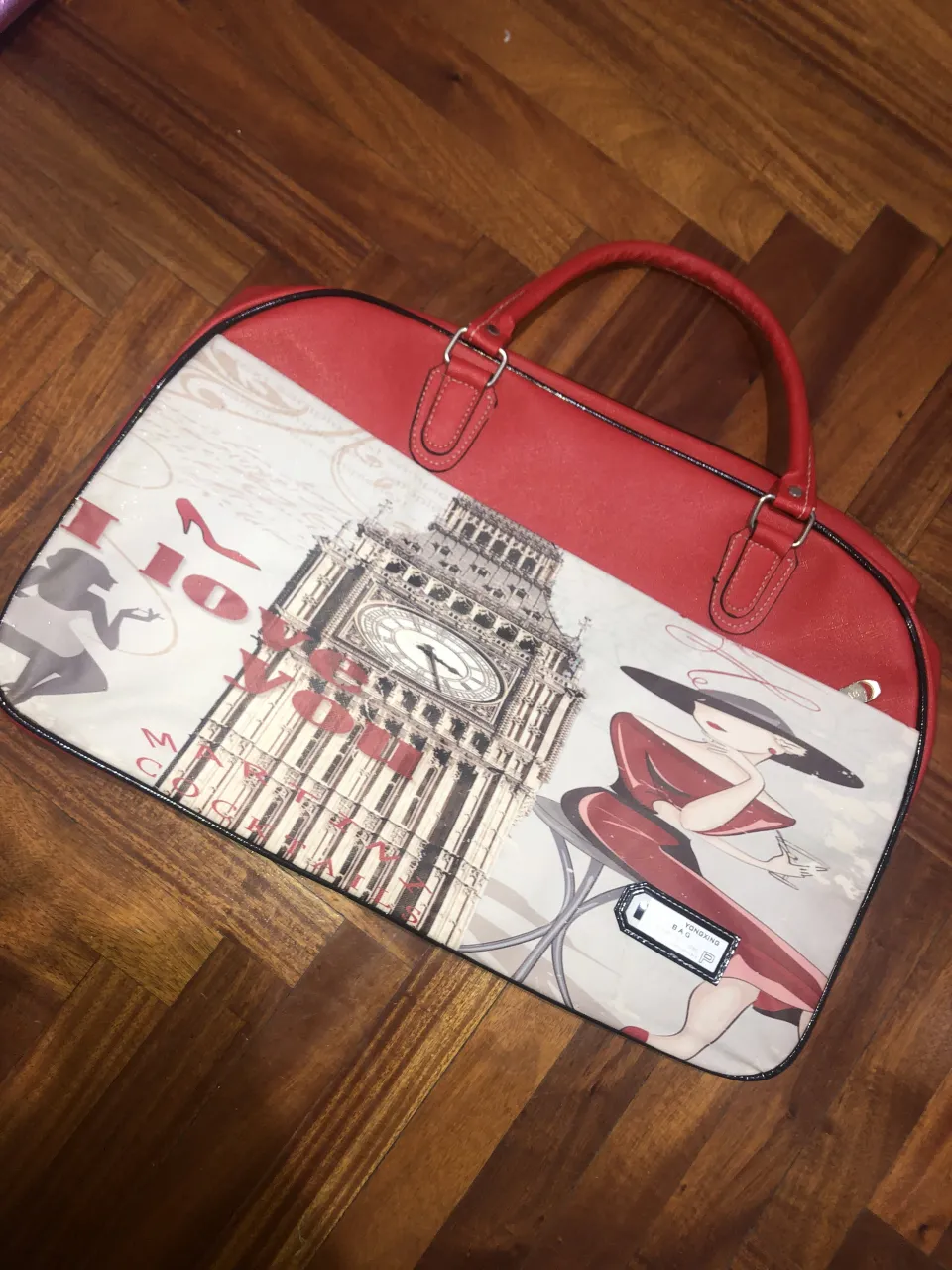Bolso de viaje o de fin de semana, color rojo, con estampa de la Torre del Big Ben y una mujer con sombrero. Tiene dos asas cortas y una correa larga desmontable. Cierre principal con divisor. MEDIDAS:49cm de largo 32,5cm de alto 22cm de ancho