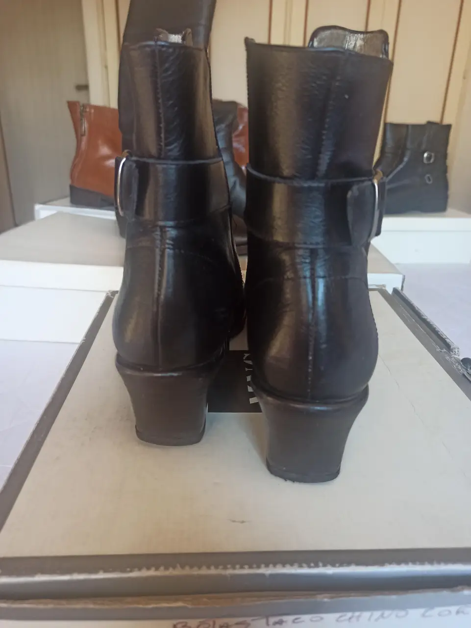 Botines de cuero negro con hebilla y taco bajo. Ideales para un look casual y elegante.