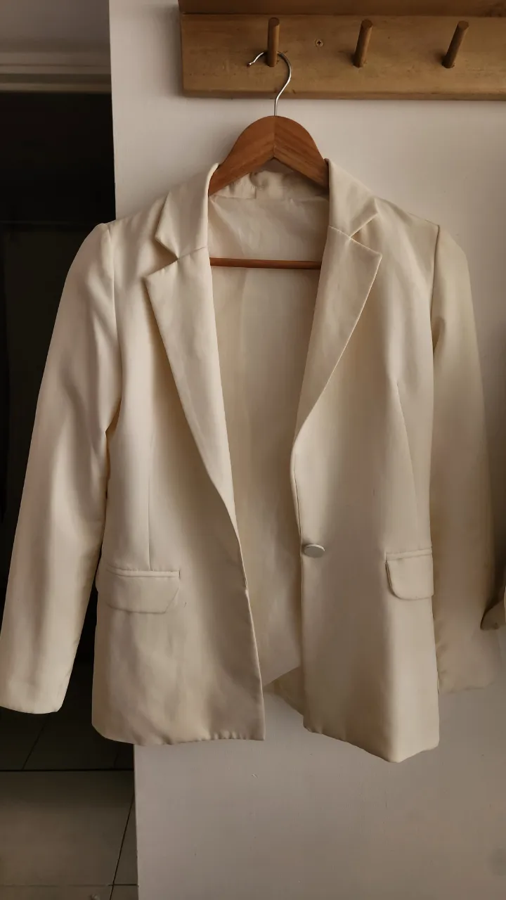 Blazer color crudo, con un botón al frente y bolsillos con solapa.