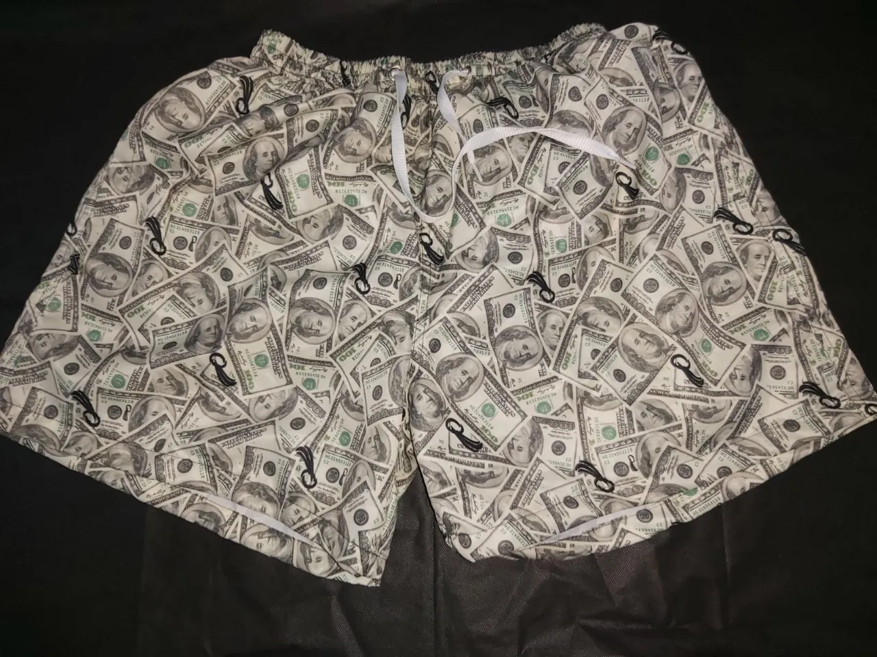 Shorts de baño con estampado de billetes de 100 dólares. Cintura elastizada con cordón regulable para un ajuste perfecto. Ideales para lucir canchero en la playa o la pileta. ancho 33 cm 32 cm de tiro 42 cm largo pierna 38 cm ancho de pierna