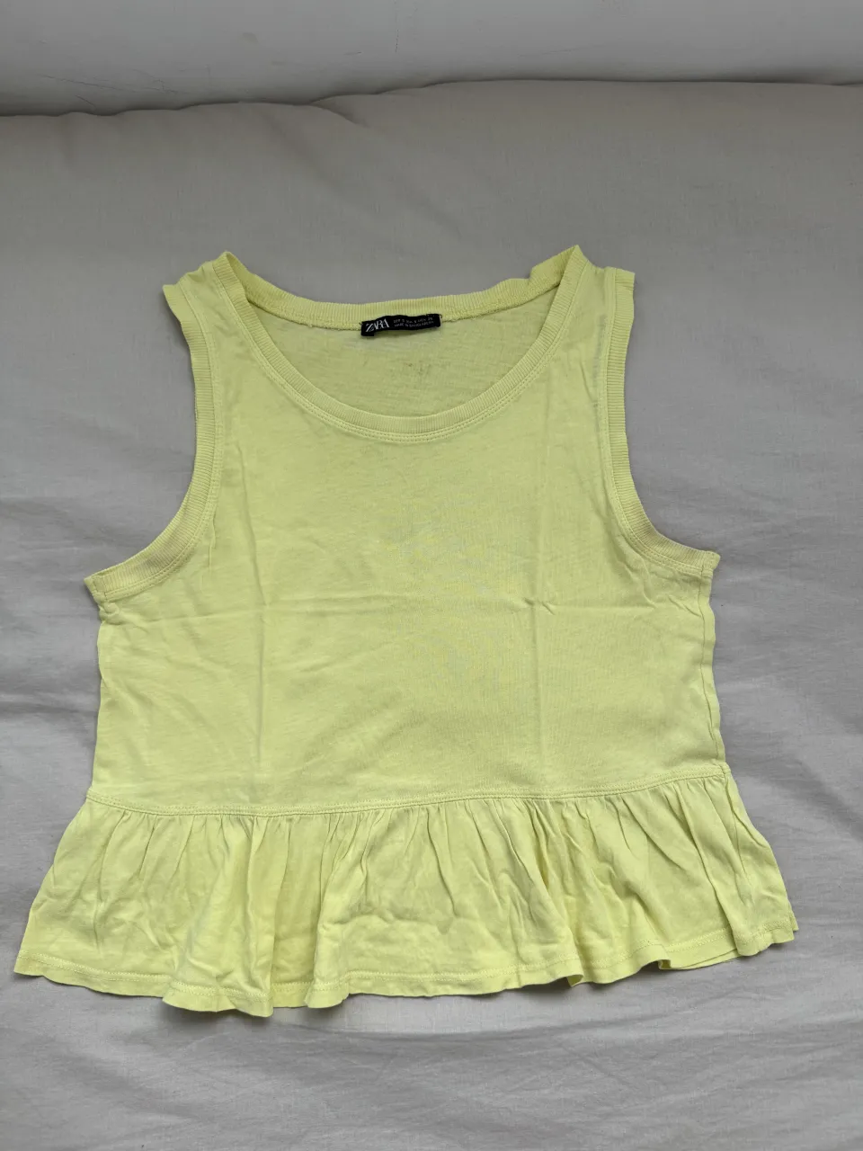 Musculosa amarilla con volados en la parte inferior. Mancha pequeña pero que no queda a la vista ya que está en la parte interna de la remera.