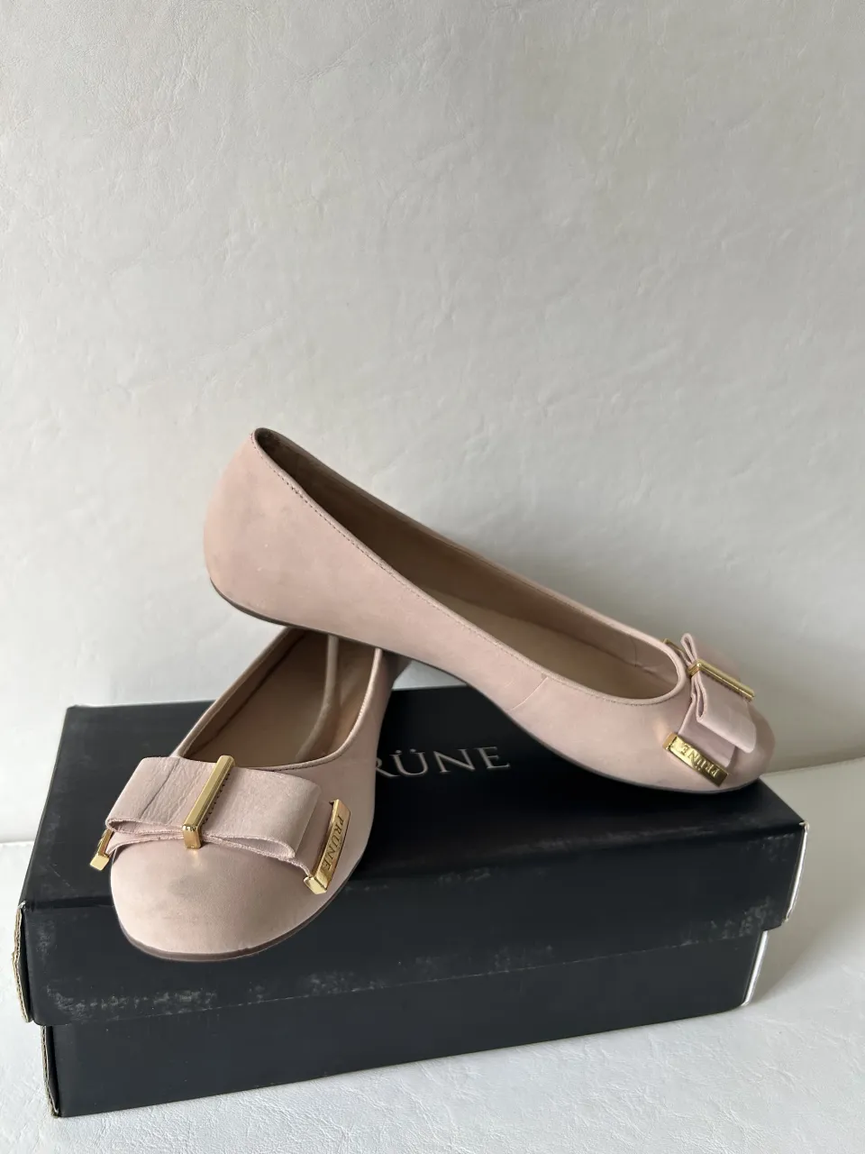 Zapatos planos color rosa pálido con moño y detalle metálico dorado en la punta. Marca PRUNE.