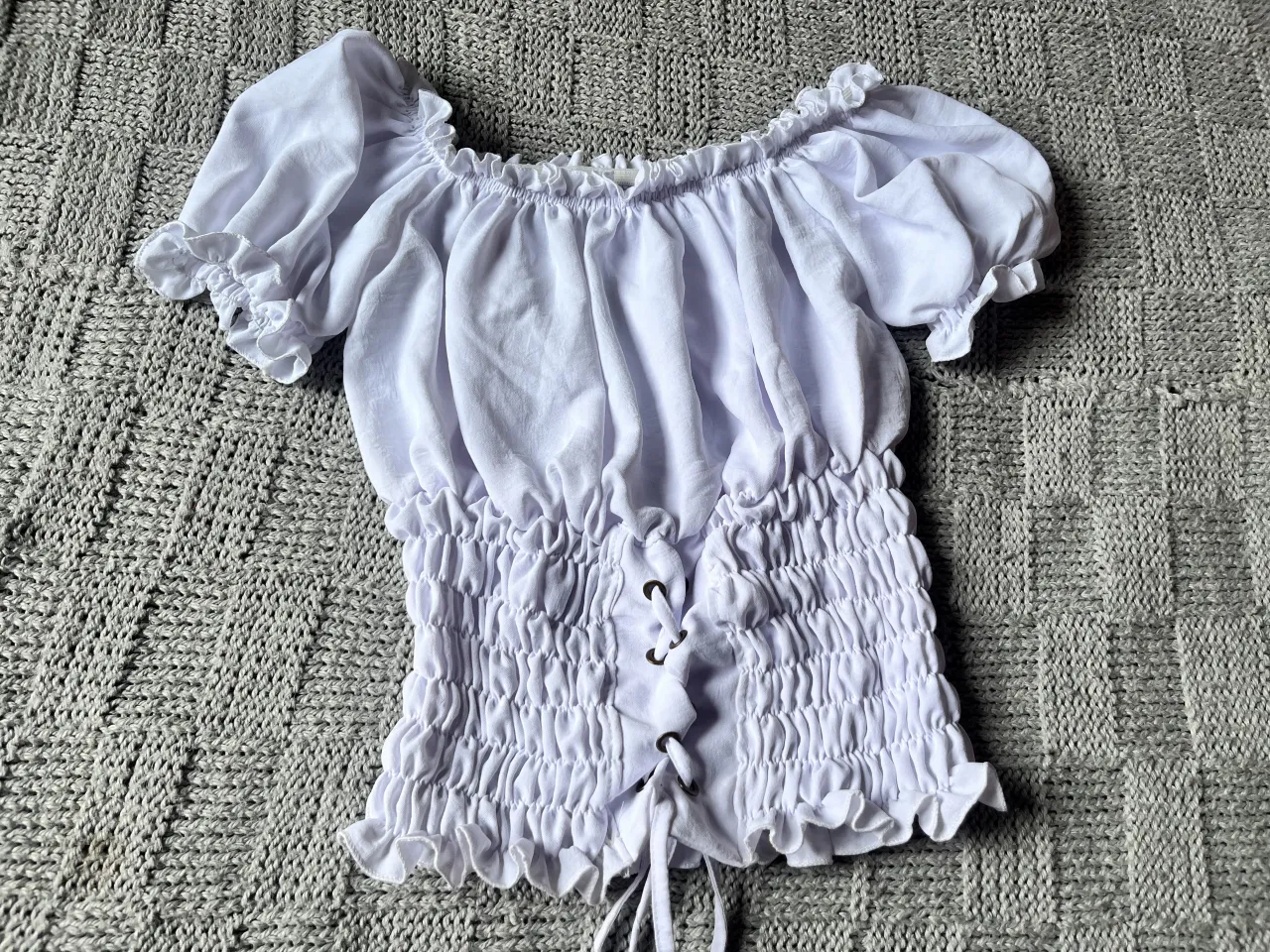 Top blanco de pirata con escote off-shoulder y mangas cortas abullonadas con volados. La parte del busto es fruncida y la cintura tiene un detalle de lazo para ajustar a tu medida.