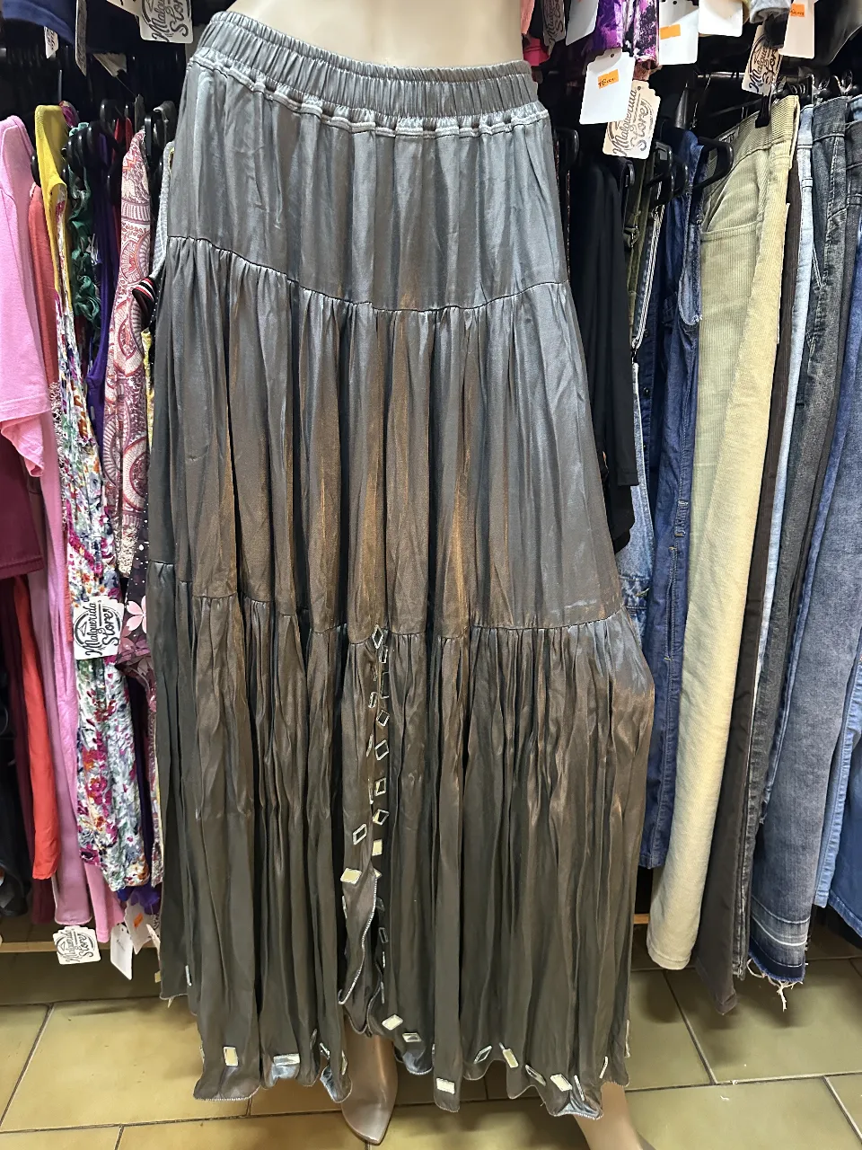 Pollera larga gris con mucho vuelo, ideal para un look boho chic. Tiene detalles de espejitos y un cordón para ajustar en la cintura. Perfecta para festivales o salidas de verano.