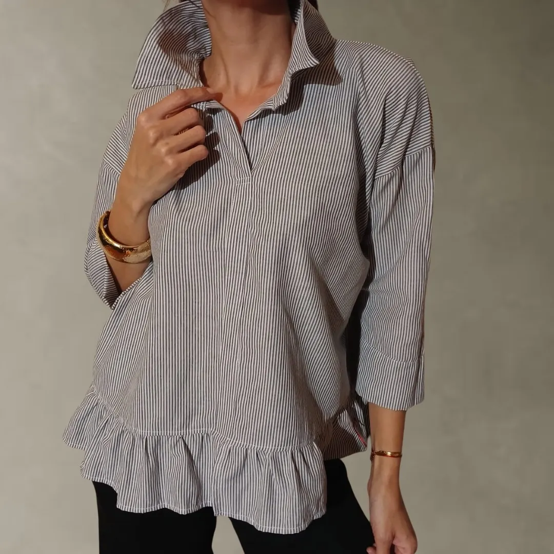 Camisa a rayas con cuello camisero y volado en el ruedo. Mangas 3/4 con puño.