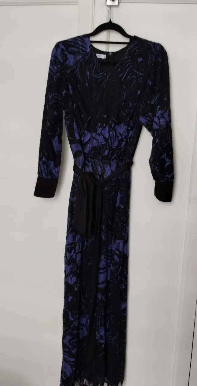 Vestido largo negro con encaje sobre fondo violeta vibrante. Posee mangas largas con puños abotonados y un lazo para anudar en la cintura, que define la silueta. Ideal para eventos o salidas elegantes.