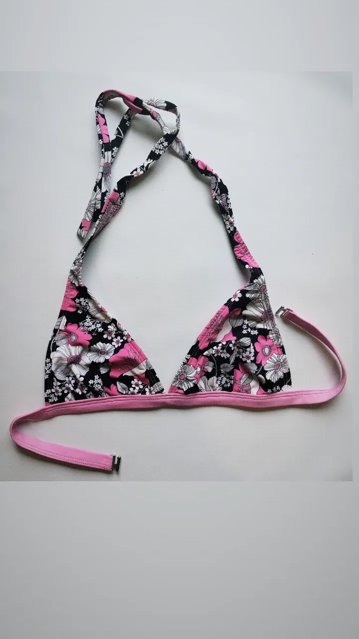 Bikini triángulo fijo estampado floral con detalles en rosa, blanco y negro. Ideal para un look playero y fresco. Talle 2